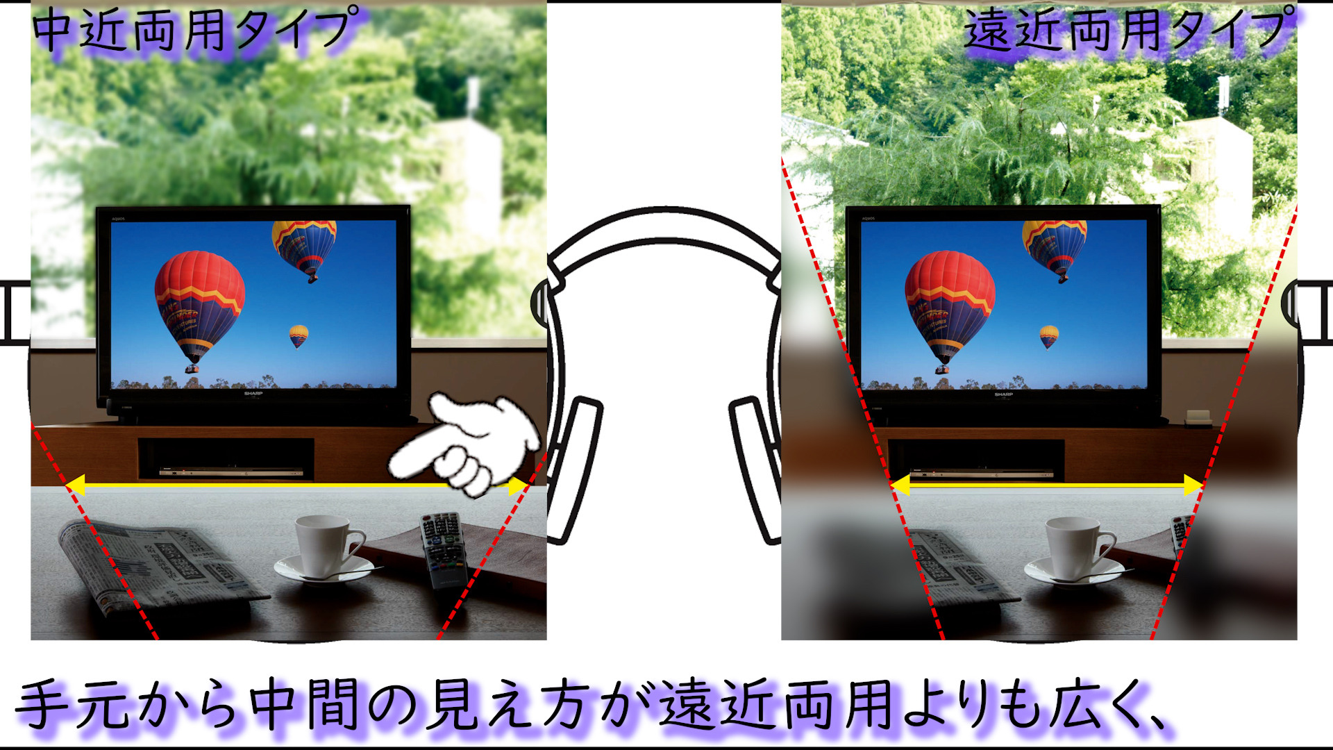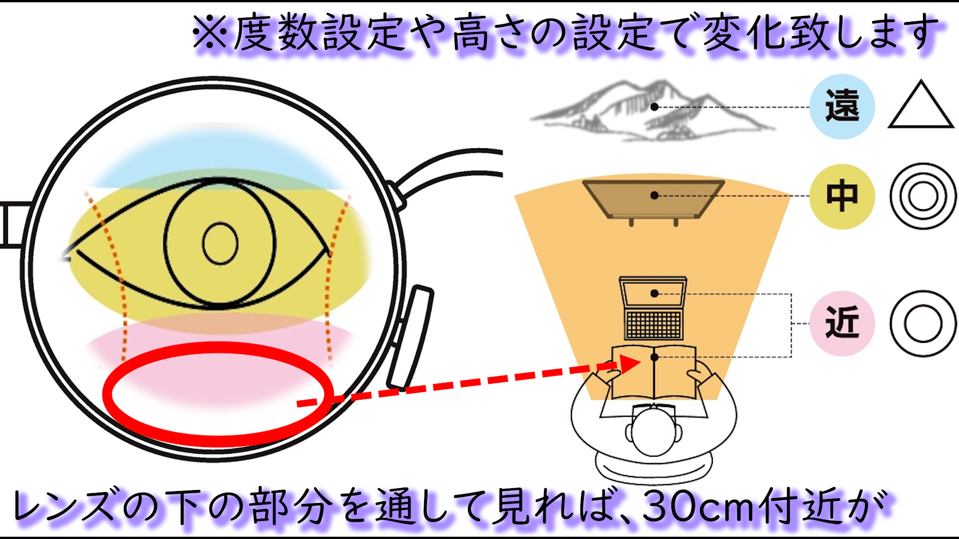 遠近両用メガネや、遠用専用のメガネでは、その負担を効率よくカバーすることが出来ない可能性があります。
