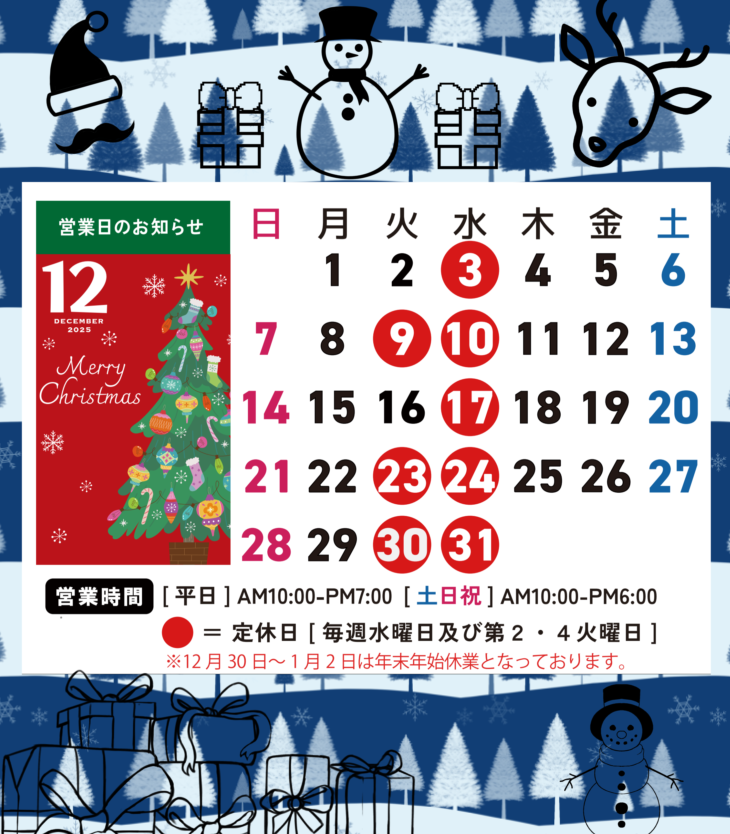 12月に入り、今年もあと僅かとなりましたので、年末年始の営業日についてお知らせ致します。