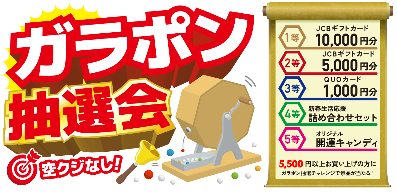 総額5,500円(税込)以上お買い上げの方にガラポン抽選で景品が当たります!