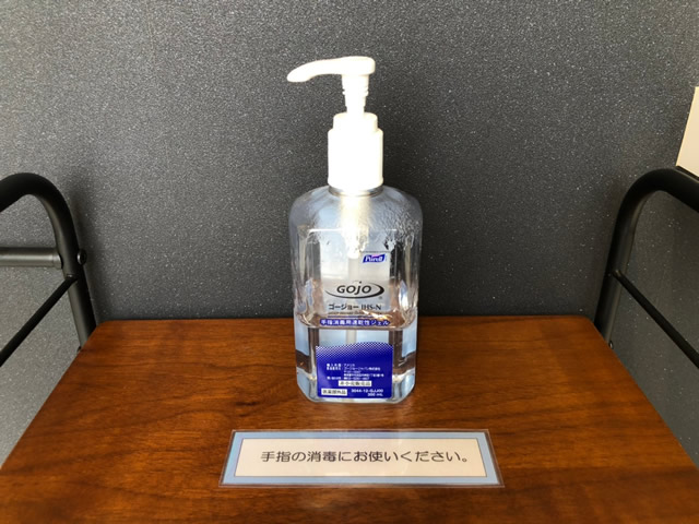① 店内入口に消毒液を設置しております。 ご来店・お帰りの際にご利用ください。